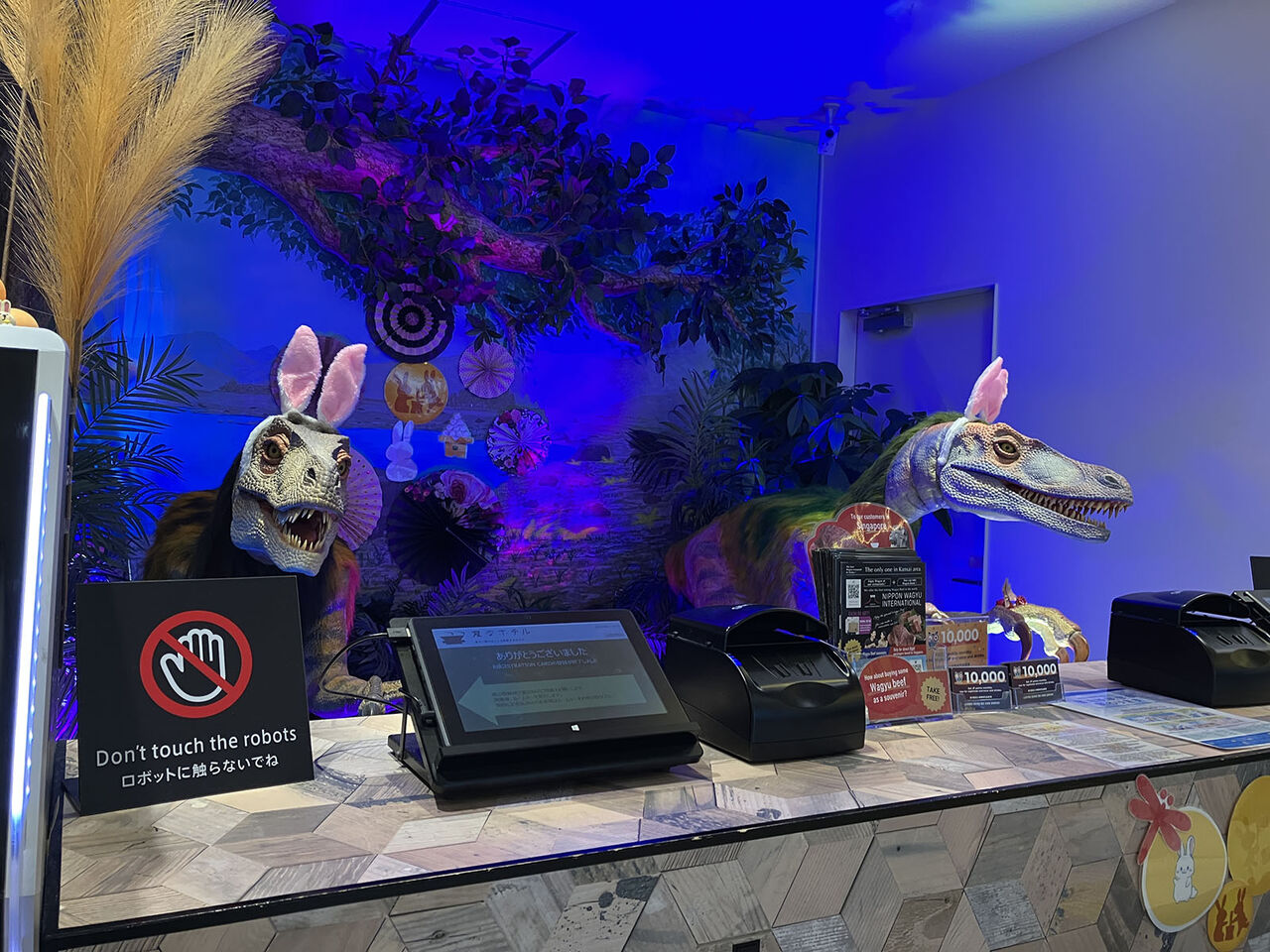 宿泊を「変なホテル」にしたので、中学生には好評でした。フロントに恐竜…! 22時すぎにふたりとも、一瞬で寝落ち。